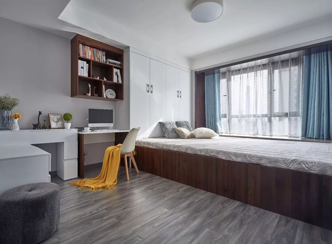 ▲木色的办公空间,配合白色的收纳,床边的空间可以满足工作、梳妆的多样化需求。