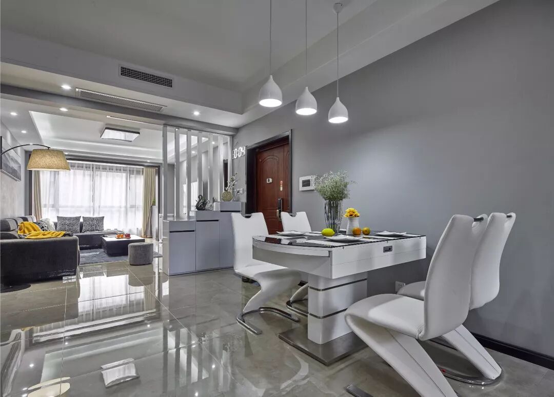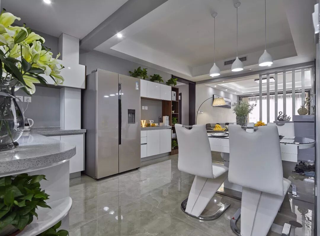 ▲白色的餐桌和餐桌椅,结合天花垂下的三盏白色吊灯,给人以现代优雅的直观感受。
