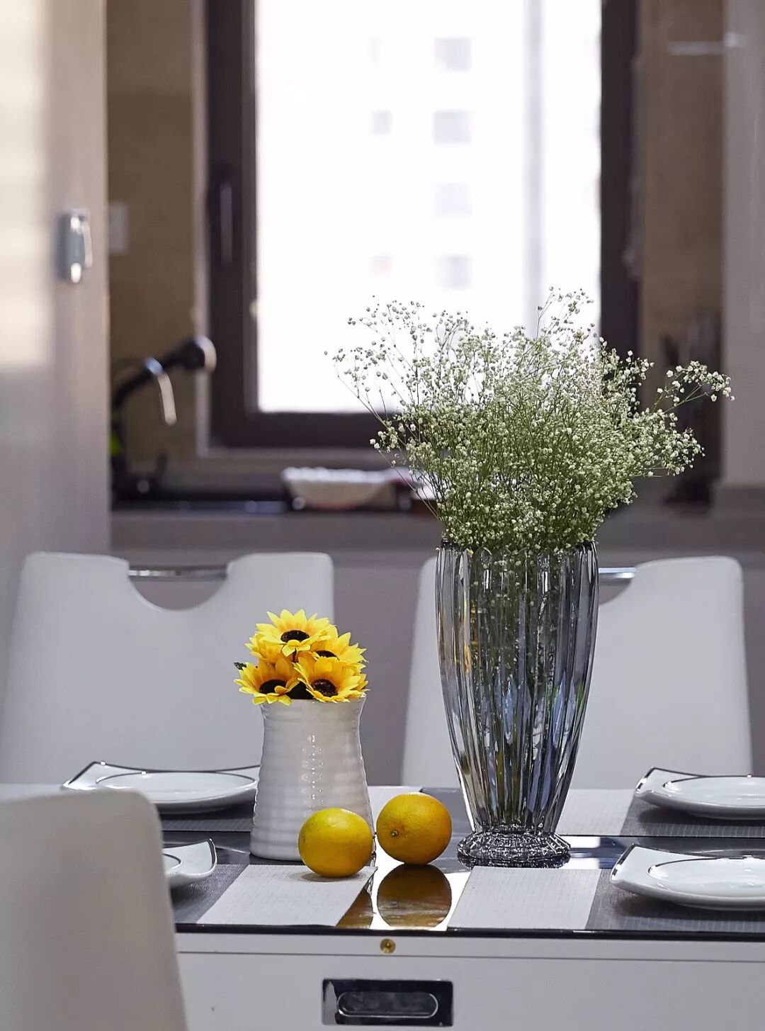 ▲精致的餐具,搭配向日葵和满天星,给餐厅空间注入了不少年轻活力。