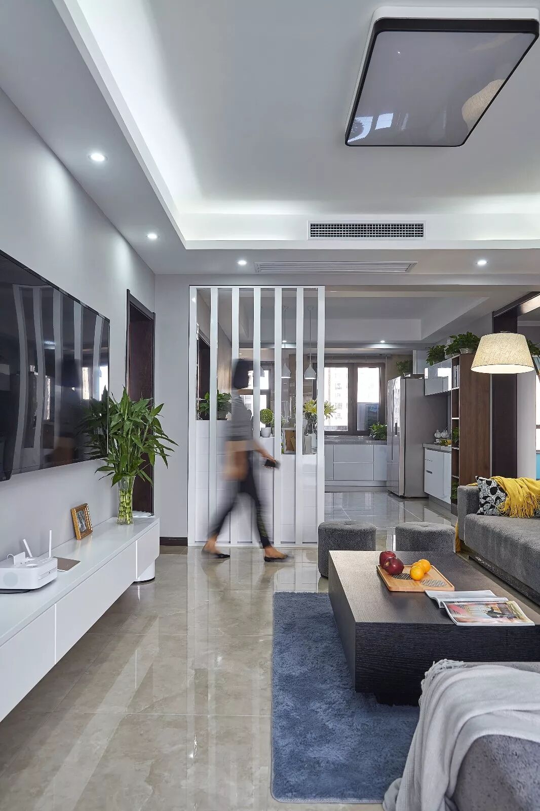 ▲电视墙一个悬空的白色电视柜,而靠近玄关的屏风隔断跟随鞋柜造型进行了跌级处理,能看到鞋柜上的风景却看不到鞋柜,装饰性十足。