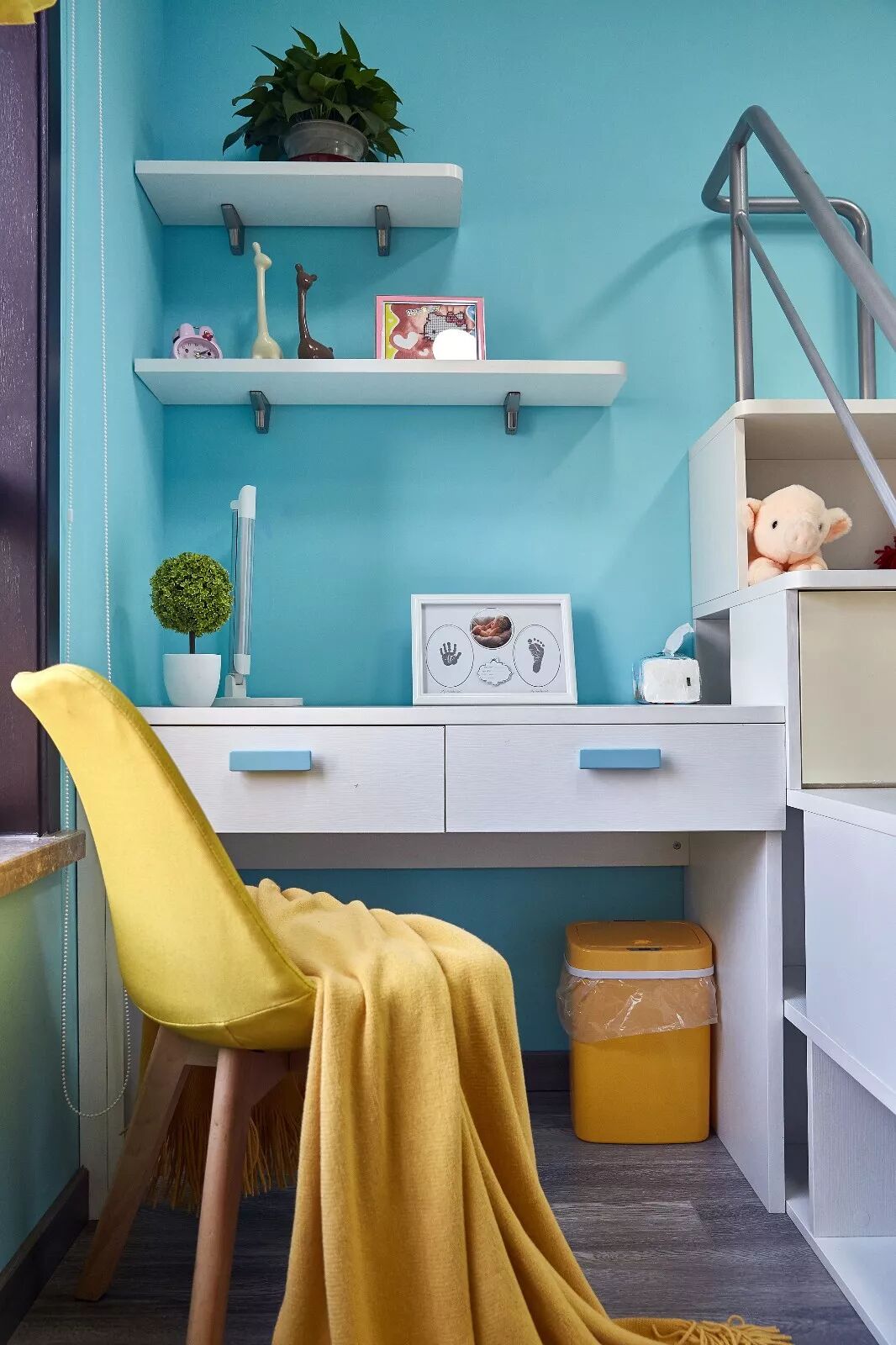 ▲靠窗以一张书桌打造了学习的空间,配合墙面简易搁架上的童趣,融入了自由自在、天真烂漫的气息。