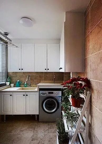 如果要在阳台摆放洗衣机的话,那么收纳柜跟洗衣机组合起来摆放也是相当常见也不错的方案,通过巧妙的结合,会让阳台更加实用简洁。